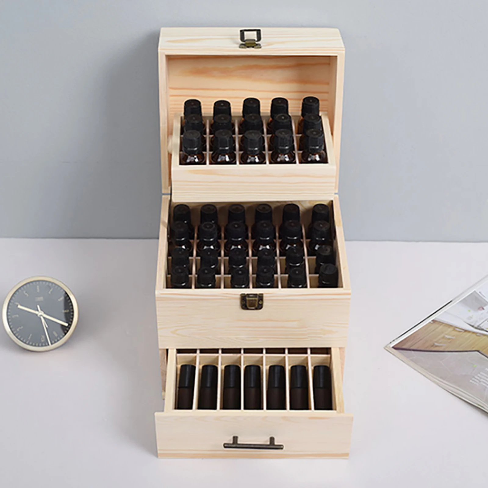 Totally 59 slots, for 15ml essential oil bottles and 10ml roller bottles.
